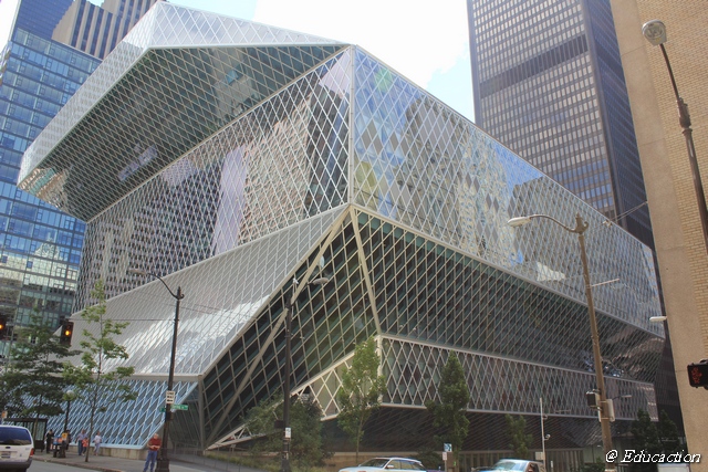 The Seattle Public Library: Esta biblioteca posee, a mi parecer, una línea arquitectónica moderna muy curiosa. A veces, los edificios tan modernos suelen no encajar con la ciudad, o bien con el lugar asignado pero en este caso el edificio en si le da especial encanto a la zona donde está situado.