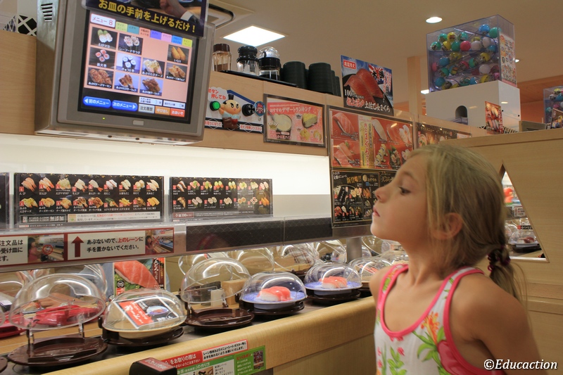 Al salir, nuestros estómagos empezaban a quejarse, Yoshi nos llevó a un “Kaitensushi” restaurante de sushi giratorio, donde los platos de sushi corrían variados. Ya los conocíamos de España pero la tecnología en Japón como siempre daba un toque diferente. Una pantalla táctil enviaba la orden a la cocina y te llegaba en pocos minutos a tu mesa a través de otra línea mas elevada, había un agujero por donde echar los platillos ya consumidos, sorprendentemente cada 5 platos, aparecía una animación de dibujos en la pantalla de elección del menú, y cada no se cuantos platos más, te tocaba un premio y salía una bolita por otro orificio con un souvenir. Si cualquier adulto estaría asombrado, imaginaros las caras de fascinación de los niños.