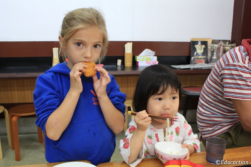 El olor, sabor y la magia de los largos fideos suspendidos en la sopa y acompañados de un sabroso tempura nos seguían a lo largo del día. Era increíble, la maestría con que la pequeña Minori utilizaba sus palillos. Varios días desayunamos en este simpático restaurante, donde su gente te hace sentir uno más. Tras ello y con nuestras barrigas de lo más alegres nos dirigimos hacia el parque de bomberos donde una gran exhibición sobre diferentes tipos de catástrofes naturales nos estaba esperando para sorprendernos gratamente. Apagamos un fuego, aprendimos a utilizar un extintor, sentimos lo que es estar sentados en una mesa mientras un terremoto de fuerza 9 en la escala Richter, sucede bajo nuestro pies, tuvimos que localizar la salida de un edificio que estaba lleno de humo, y la encontramos, y un tifón de 120 km por hora, hizo que el cabello y nuestras ropas se zarandeasen a su son. Finalmente nos despedimos del equipo que tan buen rato nos había hecho pasar, disfrazando a los niños de bomberos.